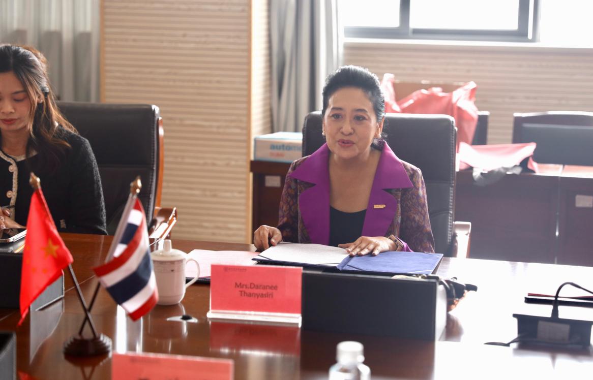王琳琳校长代表学校对泰国帕那空皇家理工大学和泰中教育联盟协会代表一行到来表示欢迎,从办学历史、办学特色和办学成就四个方面介绍了学校。王琳琳校长表示,双方本着联通共享、优势互补、互学互鉴、共同发展的合作原则,以开拓学生国际视野、拓展提升学生综合素质、增强学生国际交流能力、培养学生国际化思维模式为合作目标,努力为学生搭建国际交流合作平台,多渠道、多层次、全方位助力学生全面成长成才。Mrs.Daranee Thanyasiri对学校的热情接待表示感谢,介绍了泰国帕那空皇家理工大学的历史、办学特色等情况。同时,对我校鲜明的办学特色、丰硕的办学成果、优越的办学条件等进行了高度赞赏,期待在两校的合作中能够为学生提供更多的学习机会。