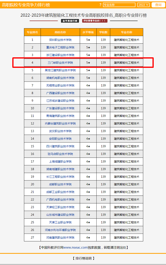 pp电子游戏平台官网建筑智能化工程技术专业在2022年中国科教评价网“金平果”全国高职院校中排名第四,水平等级5★(全国共6所5★院校),全国开设建筑智能化工程技术专业的学校数139所,这是该专业继2021年之后第二次获得此等级评价。