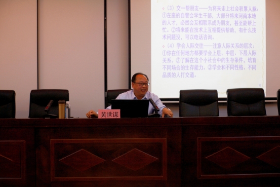 黄世谋从蘑菇理论、木桶理论、马斯洛需要层次理论、21天效应、刺猬法则等八个理论、五个效应、四个定律法则详细诠释了思维成熟的重要内涵,结合大学生学习和生活,对各个理论、效应进行了全面细致地讲解。他还通过生动的事例和分享自身经历,对学生们的学业规划、职业规划和人生规划提出了宝贵的意见和建议,为大学生指引了前进的方向。