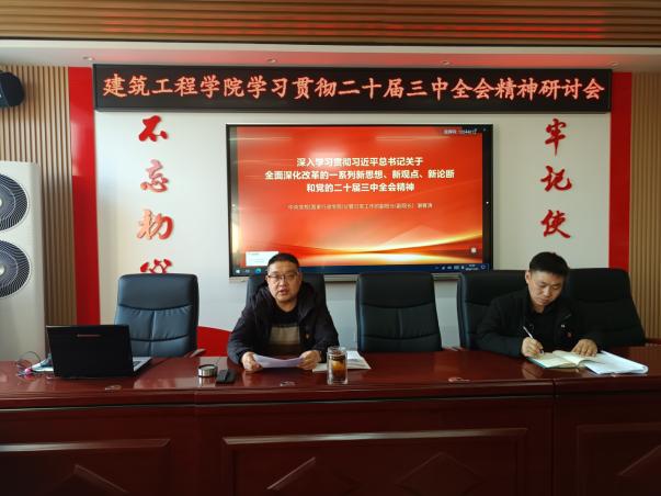 根据学院《关于开展科级及以下干部党员学习贯彻党的二十届三中全会精神培训的通知》要求,11月21日下午,pp电子游戏平台官网组织党员教师在天鹅湖校区5512党员活动室集中观看由中央党校(国家行政学院)副校长(副院长)谢春涛讲授的“深入学习贯彻习近平总书记关于全面深化改革的一系列新思想、新观点、新论断和党的二十届三中全会精神”网络党课并进行学习研讨。研讨会由党总支书记雷旭锋主持。