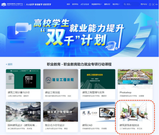 近日,教育部高校学生就业能力提升“双千”计划公布入选名单,pp电子6门优质课程成功入选国家智慧教育平台职业教育板块,其中pp电子游戏平台官网建筑室内设计专业李玉洁老师主持的《建筑装饰表现技法》课程凭借其鲜明的实践特色与产教融合优势脱颖而出,彰显了学院在建筑装饰领域人才培养的显著成效。