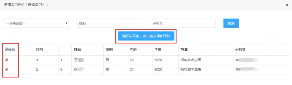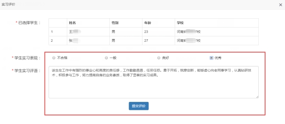点击【新增评价】,选择学生,点击【选好实习生,点击前去添加评价】,进入实习评价界面,完善学生实习表现和学生实习评语,点击【提交评价】,完成新增评价操作。