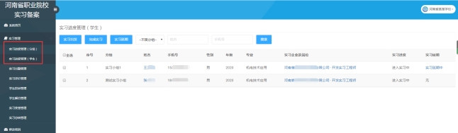 在学校或二级院系完成实习学生的编班分组、指定实习指导老师之后,实习指导老师便开始对所负责的学生进行管理,包括实习进度管理、实习出勤管理、实习评价管理、实习评价管理、实习投诉管理、实习解约管理、实习荣誉管理、实习总结管理。