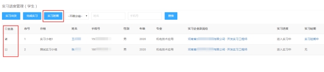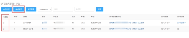 学生在出发去实习企业时、学生在完成实习任务时以及学生实习需要延期时,需要指导老师在此处完成实习进度更新。指导老师可以一次选择多个实习小组或多个实习学生进行批量处理。