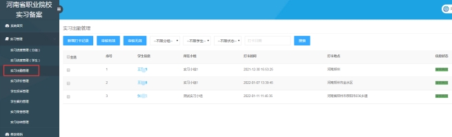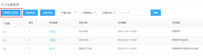实习期间,指导老师可查看、管理学生在手机APP端的打卡出勤记录,根据实际情况审核通过或不通过学生的打卡信息,还可以根据学生的申请新增打卡记录。