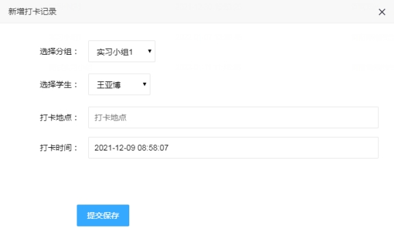 点击【新增打卡记录】,选择学生,输入打卡地点、打卡时间,点击【提交保存】,完成新增打卡记录操作。