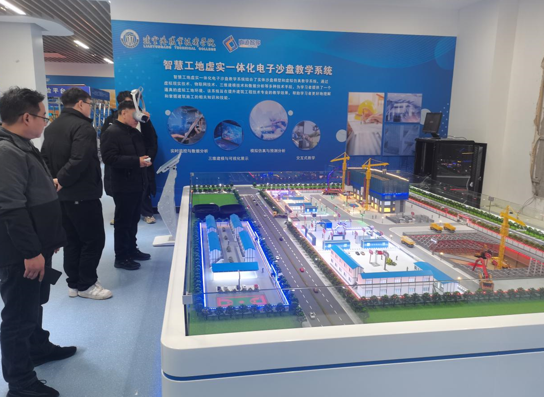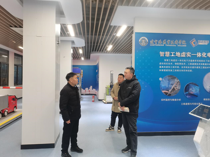 考察组一行先后参观了由真道智享公司在连云港职业技术学院建立的智能建造和装配式建筑实训室,并认真听取赵炜经理的介绍,全方位了解实训室的设计理念和建设思路。后续,张院长深入体验我司研发的BIM+智慧工地数字孪生沙盘产品,为后续pp电子游戏平台官网相关实训室的建设和优化提供参考。