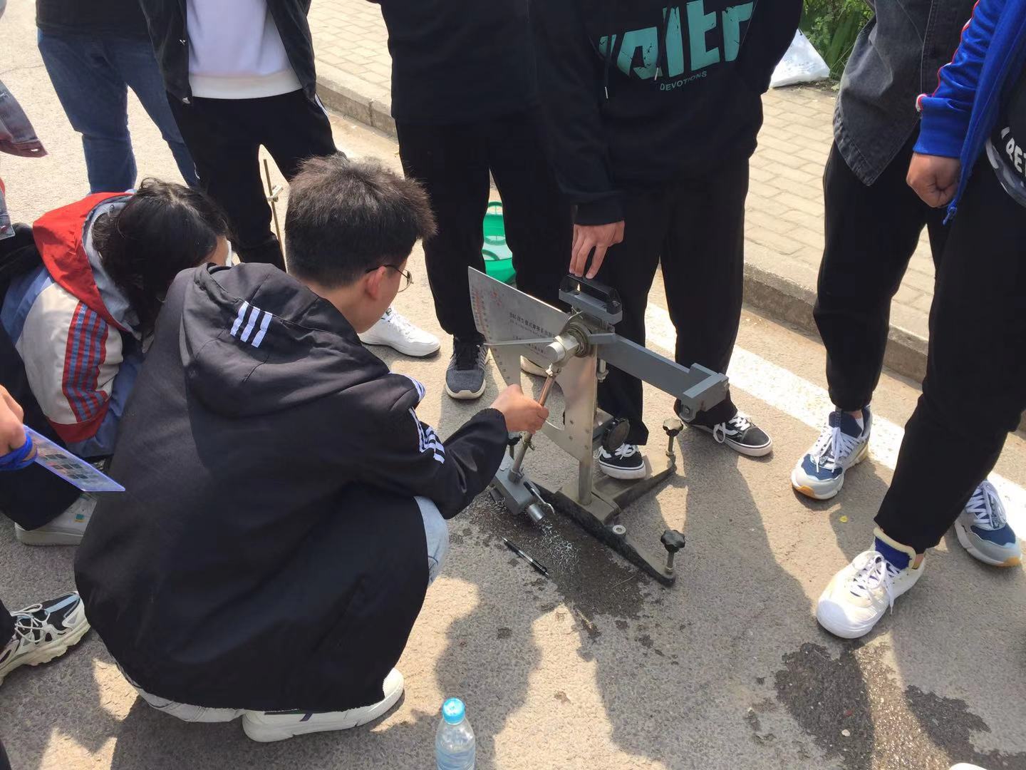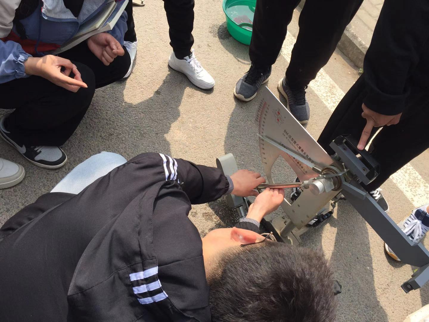 路桥专业学生对路面的摩擦系数通过摆式仪进行测定,通过计算从而评估路面的抗滑性能。