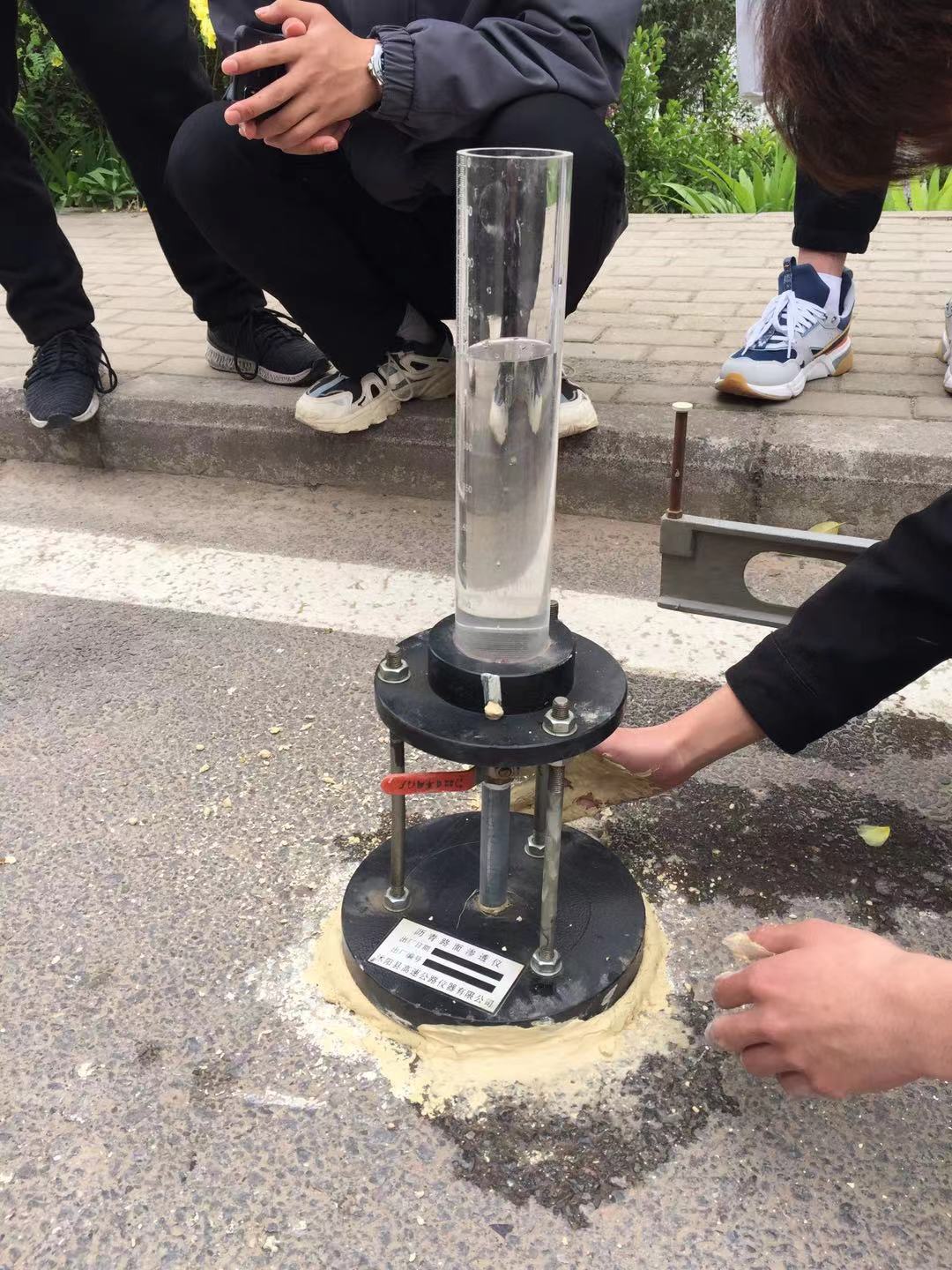 路桥专业学生通过路面渗水仪测定渗水系数,推断路面构造深度对路面抗滑性能的影响。