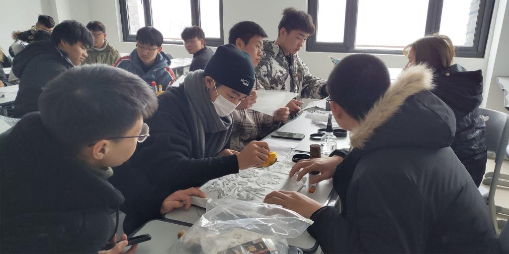 《拓片制作》课程在课堂之外还安排同学们到校外实践场所认识学习。同学们参观了虢国博物馆,对馆藏文物的高精拓片认真学习,并将学习的技术用于实践项目。