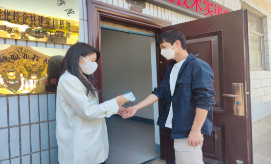 演练时同学们有序排队进入教室(左宋倩老师,右智能化一班刘子琛),用心聆听老师所讲的防疫步骤,防疫措施;老师强调口罩的佩戴规范,上课距离的保持,及上课时身体不舒服及时举手示意。