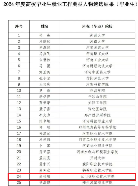 近日,河南省教育厅公布了2024年度高校毕业生就业工作典型案例遴选结果,pp电子游戏平台官网推荐的2024届建筑智能化工程技术专业毕业生尚硕硕被评为2024年度高校毕业生就业工作典型人物。
