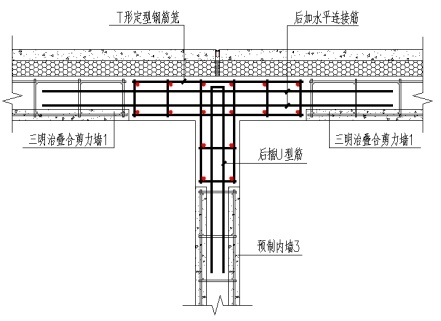 1.叠合内墙板构件。由两层预制板和成型钢筋骨架制作而成。内部放置成型钢筋骨架,通过翻转设备(或免翻转设备)浇筑两层预制板,预制板通过成型钢筋骨架连接。叠合剪力墙利用两外侧预制部分作为模板,中部现浇层与叠合楼板的现浇层同时浇筑。