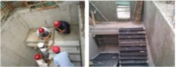 在上层墙体出模后,吊装下层预制楼梯踏步板,保证 L 型梁强度。