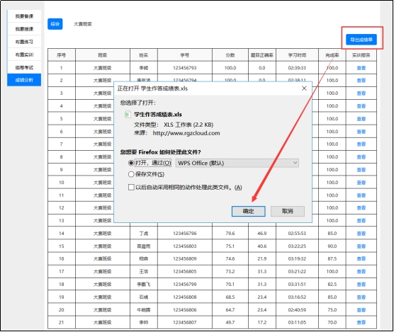 (1)选择成绩分析,点击对应任务书可进行学生完成情况及各题正确率的查看