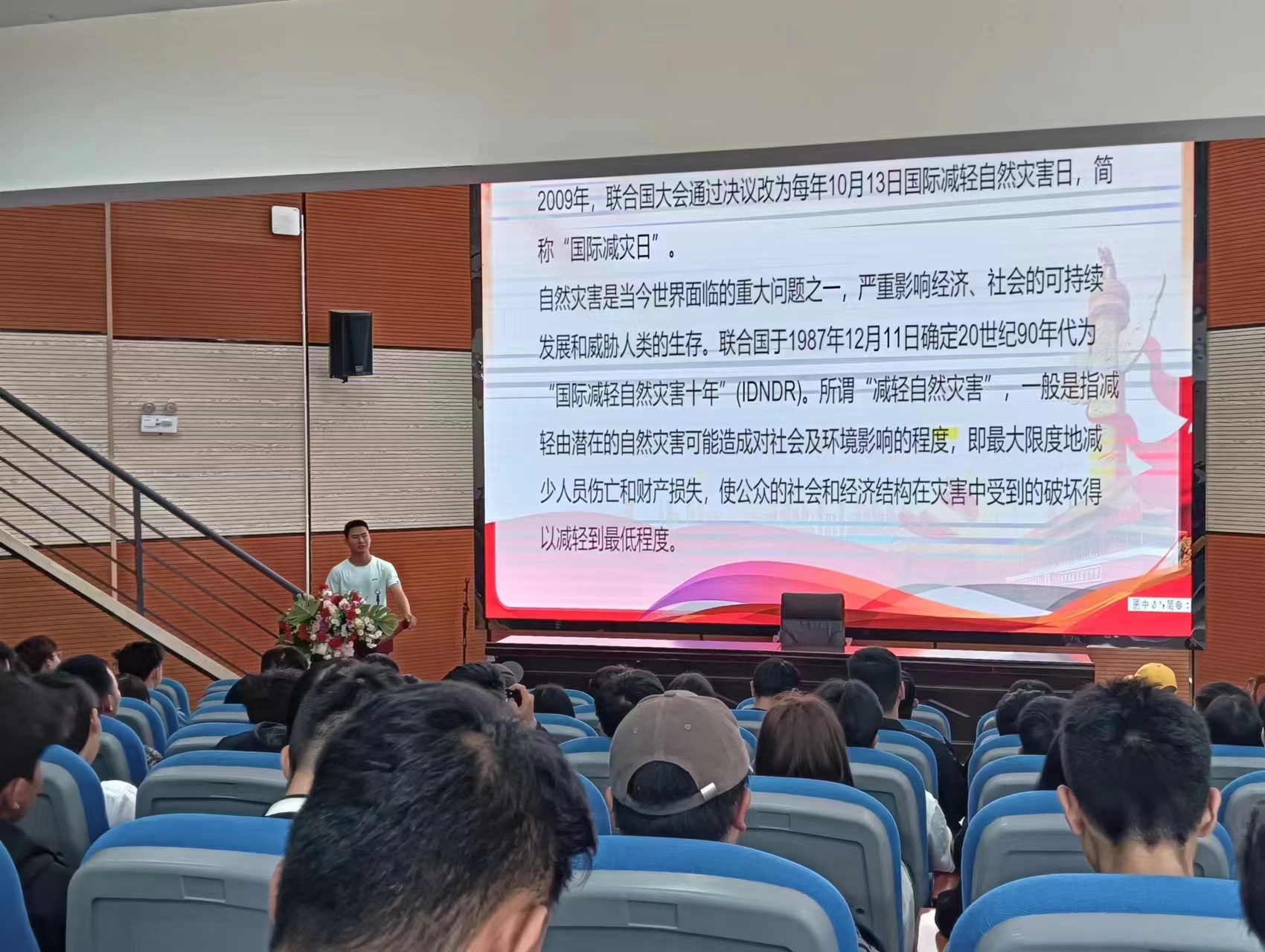 为进一步提高全体师生安全意识,提升自然灾害防治意识,提高防灾减灾救灾能力,着力打造和谐稳定校园。10月20日下午,安全稳定处在报告厅进行了2023年国际减灾日知识宣讲活动,学校400名学生代表参加讲座。讲座采用线上线下同步进行的方式,全校师生10000余人参与到讲座中。