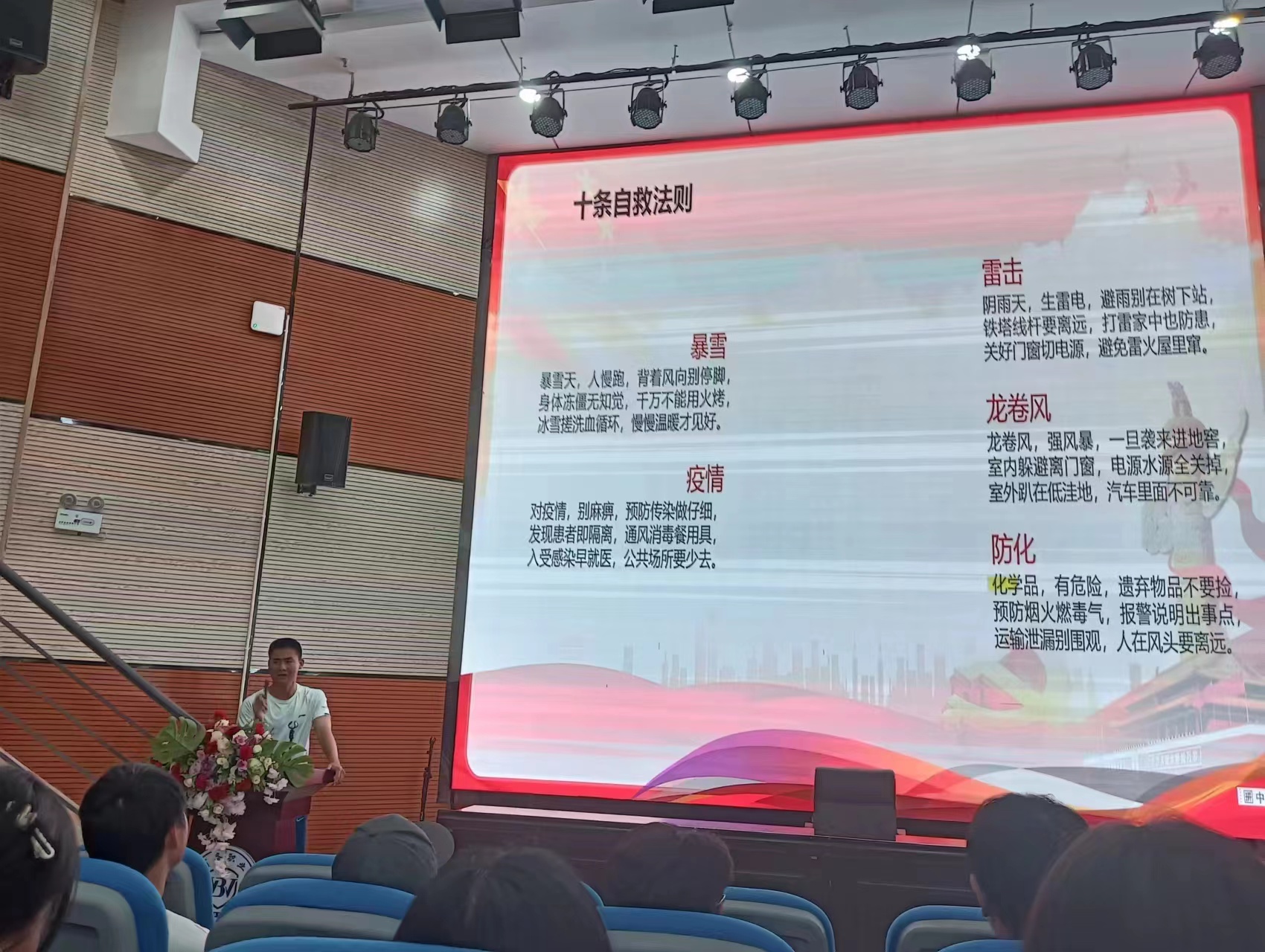 本次讲座围绕自然灾害暴雪、雷击、疫情、龙卷风、防化、火灾、地震等安全事故处理技能知识进行了多个方面深入讲解,帮助师生树立和提升自然灾害防范意识,紧急避险意识,应急救护意识。