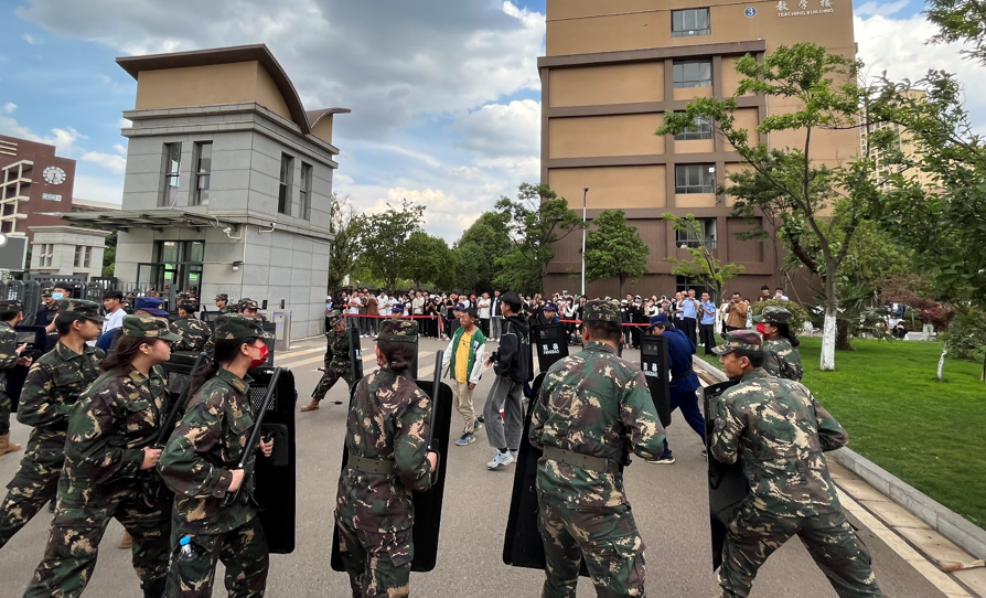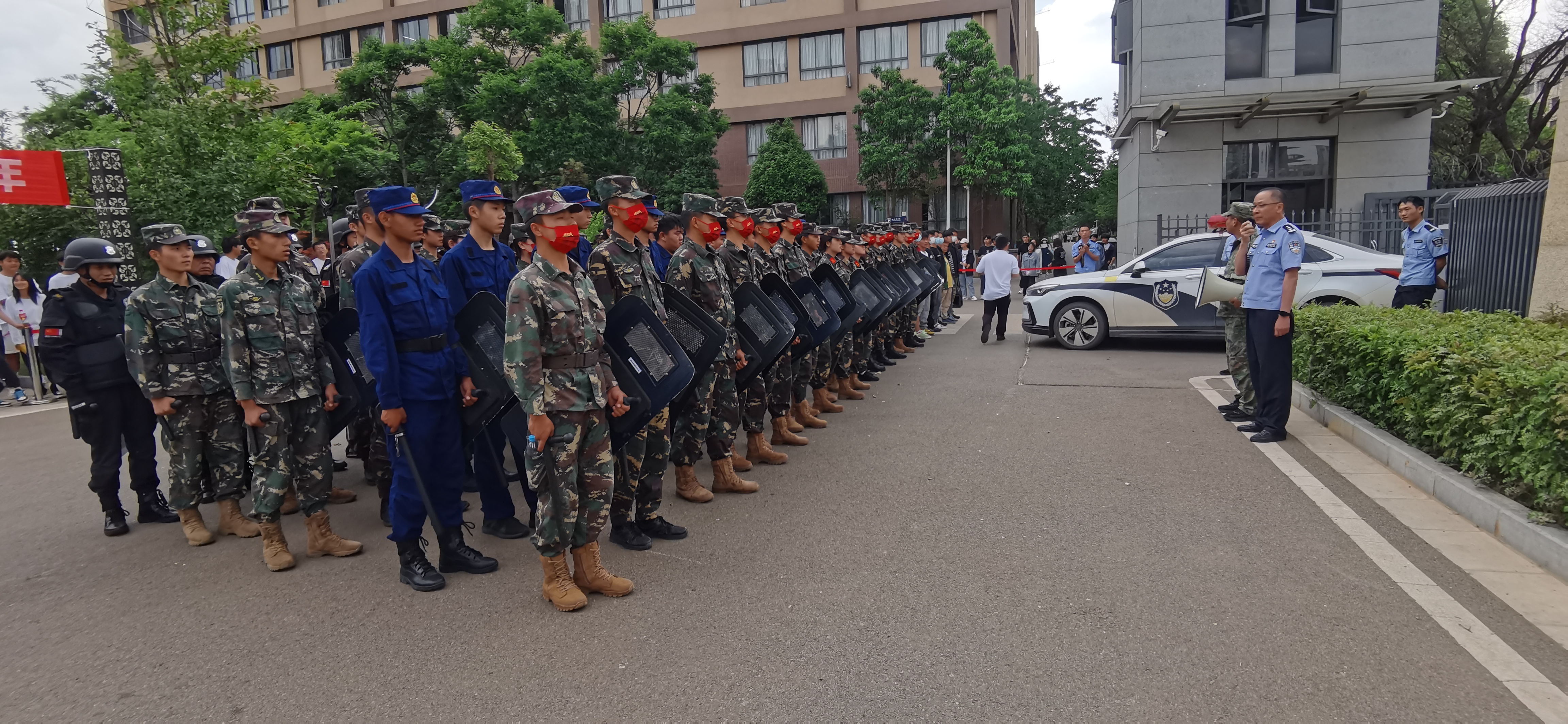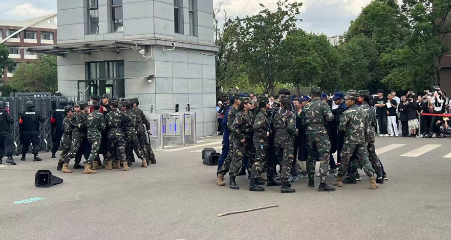 主题活动四:组织反恐防暴应急演练:下午17时许,多名疑似暴恐角色扮演者陆续登场,手持凶器,放火爆炸,在门口跃跃欲试,试图暴力冲击校园,反恐防暴拉响了警报。在反恐防爆演习中,按照学校突发事件处置预案和流程,立即启动预案、分级处置、梯队增援、分头报告,在保安喊话和采取防爆措施的情况下,增援力量采取防爆队形包围、分组夹击等措施成功控制暴恐分子,公安机关及时到场处置。演练结束时,嵩明县反恐办副主任、国保大队副大队长章亚群警官进行现场点评,总结经验,查找不足,检验了学校处突响应能力、应急指挥能力、临机处置能力,一定程度上检验了工作、锻炼了队伍。
