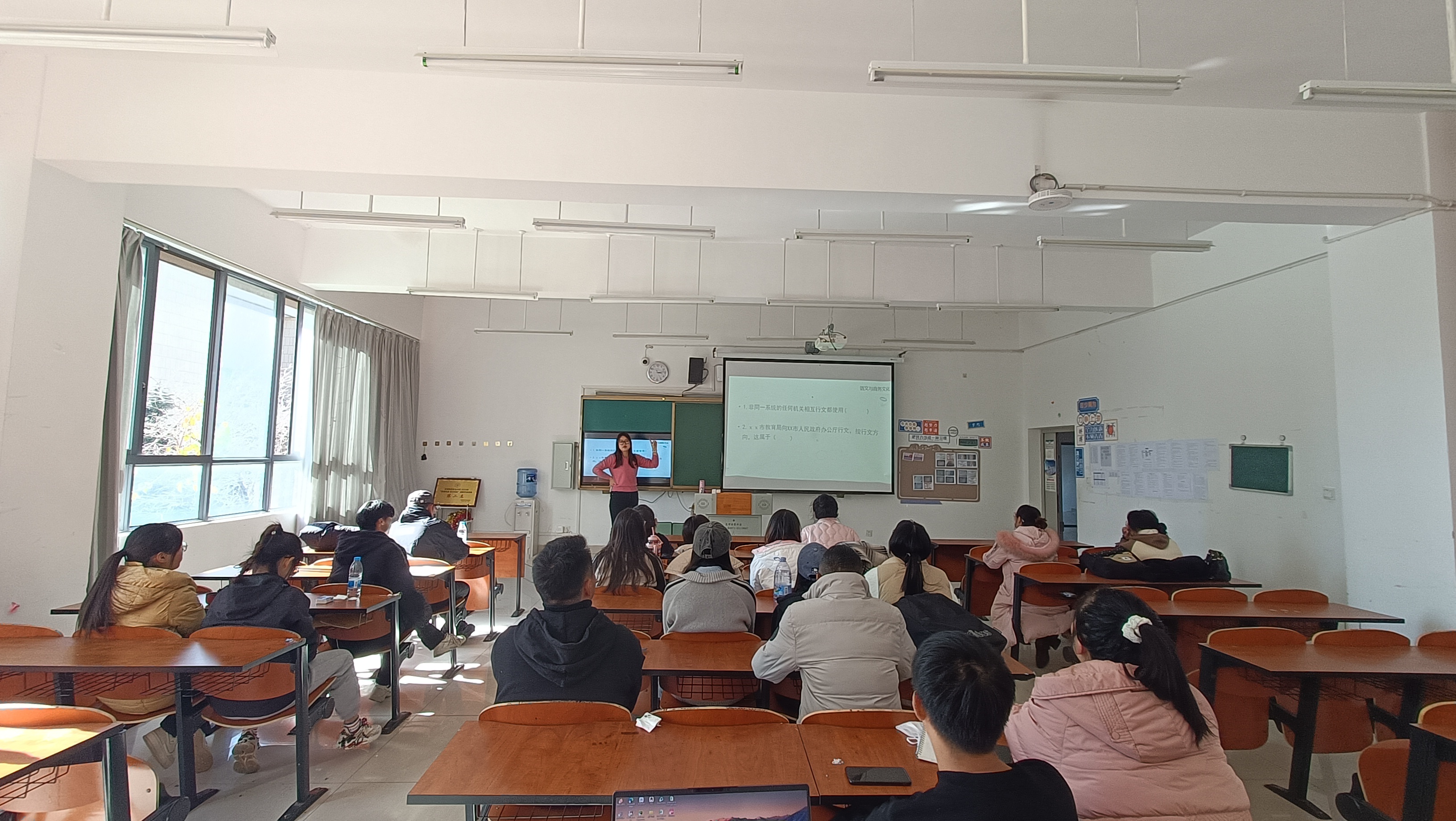 张丽君老师在公文写作课上。聚焦《通知》这一实用文种。课程伊始,张老师运用巧妙的方式导入新课,迅速激发大家的学习兴趣。在概念讲解环节,她深入剖析通知的定义、特点及行文方向,逻辑清晰,引人入胜。针对转发性通知、告知性通知等不同类型,张老师通过对比辨析和课堂练习,让学生们在实践中准确把握其差异。在讲解通知结构时,张老师别出心裁地将其类比为一个“人”,生动形象地阐述了标题、主送机关、正文,包括通知缘由、主体、结尾,以及落款署名+日期,各部分的作用与写作要点,使复杂的知识变得通俗易懂。