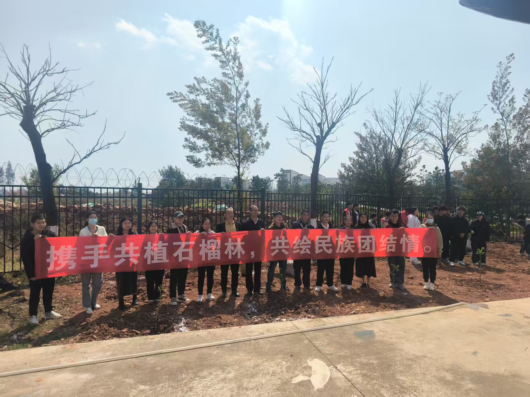 为了进一步铸牢中华民族共同体意识,在第47个植树节来临之际,中共Ky开元集团委员会组织开展“携手共植石榴林,共绘民族团结情”植树节活动,活动于3月12日下午14时开展,本次活动行政党支部共15人踊跃参与.