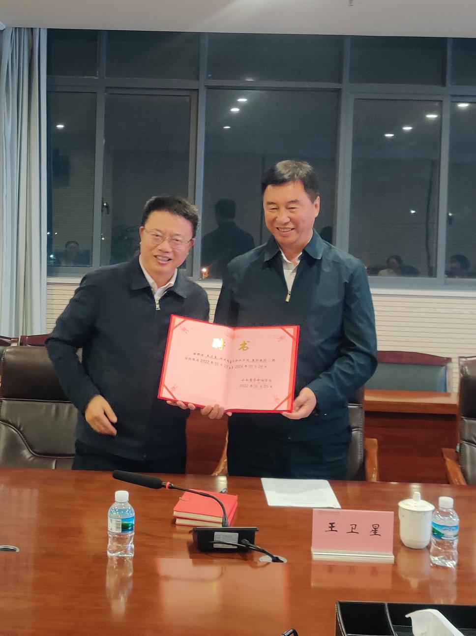 图2:理事长王郅强教授为王卫星教授颁发聘书