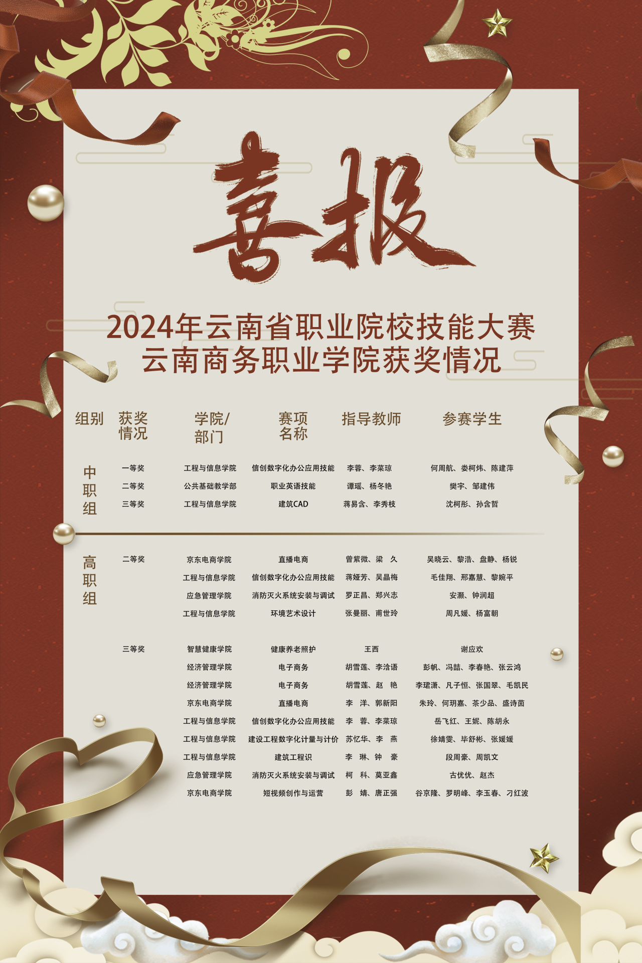 2024年云南省职业院校技能大赛高职组比赛和中职组比赛分别于9月26—30日、10月21—25日在昆明市和玉溪市举行。我校师生在此次省级技能大赛中捷报频传,共获得中职组一等奖1项,高职组二等奖4项、三等奖6项优异成绩,在获奖等次、总数上均创学校参赛以来历史新高。
