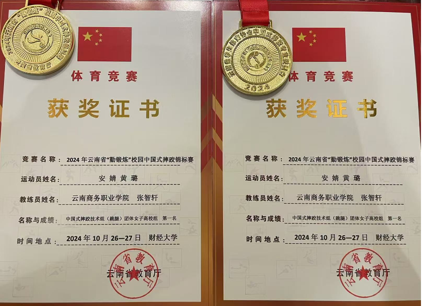 在女子团体组比赛中,黄璐和安婧两位同学凭借卓越的技艺和默契的配合,荣获“中国式摔跤技术组(跪腿)团体女子高校组金牌”