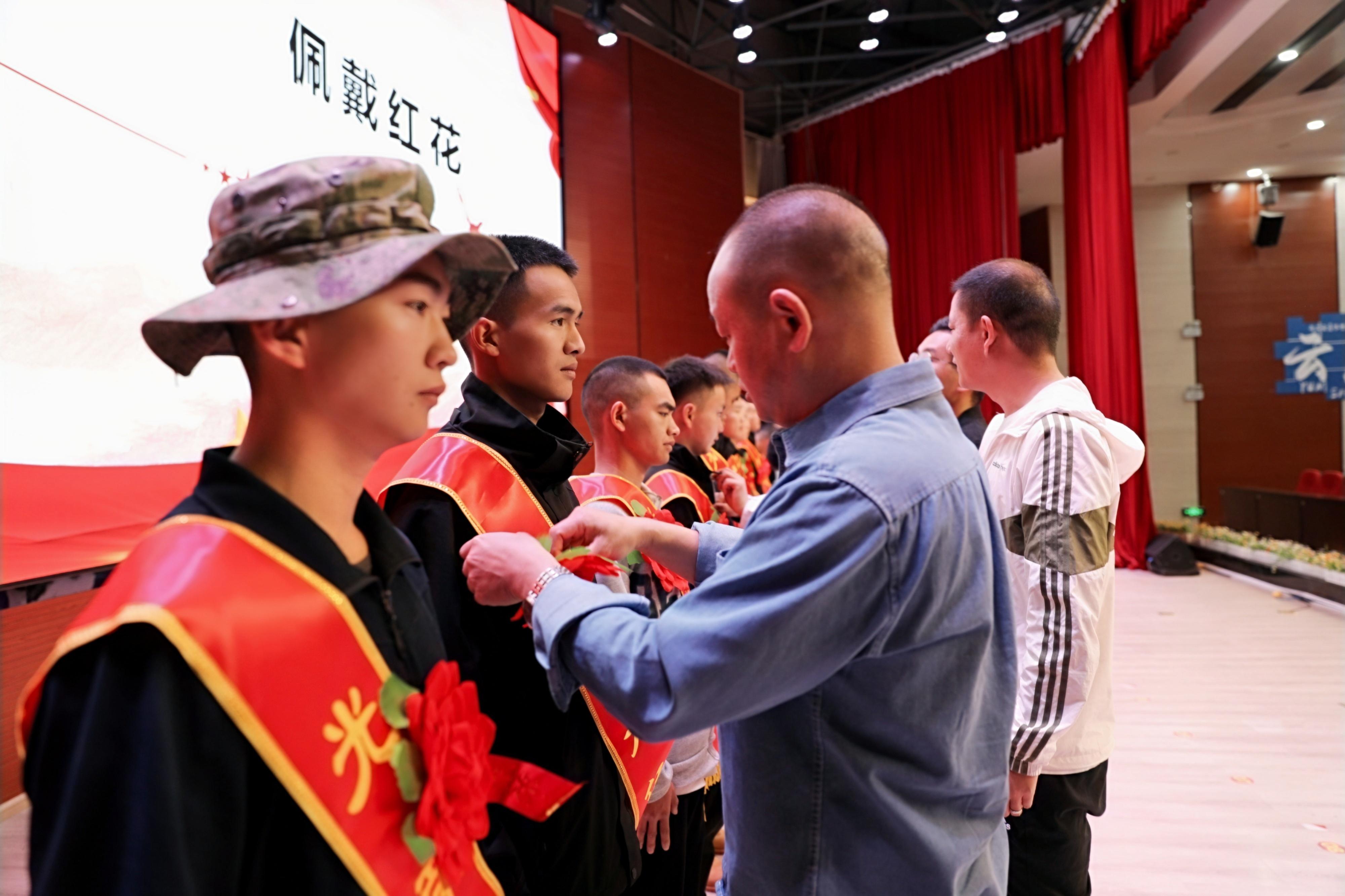 在《强军战歌》的磅礴旋律中,校领导为12名新兵逐一佩戴绶带。红花映衬着年轻的脸庞,绶带上"光荣入伍"的金色字样在灯光下熠熠生光。