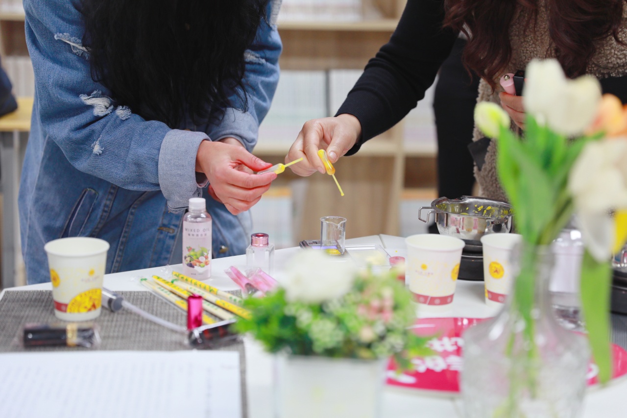 随后,“匠心手作,定制专属色彩”口红DIY环节将现场气氛推向高潮。专业手工导师从原料配比、调色技巧到安全事项进行详细讲解,女教职工们化身“美妆科学家”,专注地调配色粉、加热搅拌、灌装模具。精密操作与艺术创作的灵感碰撞,让现场充满欢声笑语。