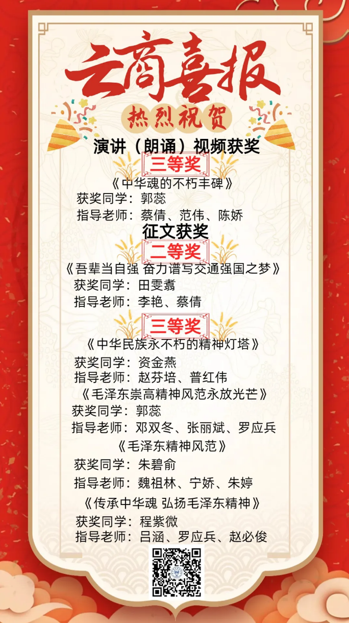 近日,云南省教育厅关心下一代工作委员会发布的2024年“中华魂”(毛泽东崇高精神风范)主题教育读书活动评选结果正式公示,学校推选作品共获得6个奖项,包含全省高校组演讲(朗诵)视频三等奖1项、高校征文二等奖1项、三等奖4项。
