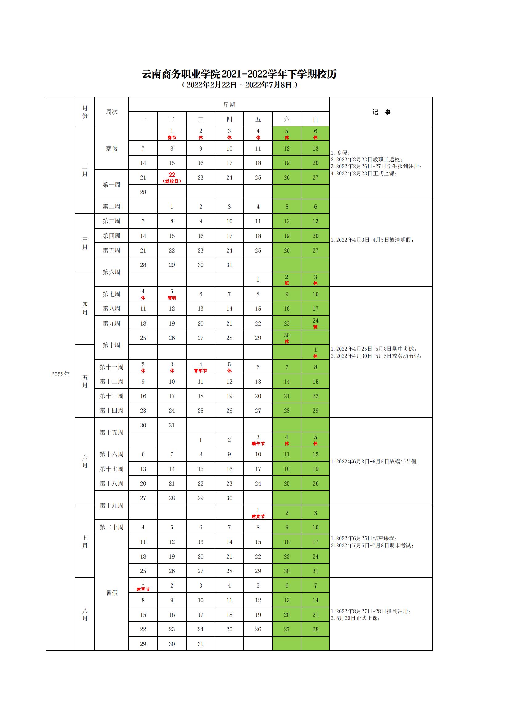 Ky开元集团2021-2022学年下学期校历