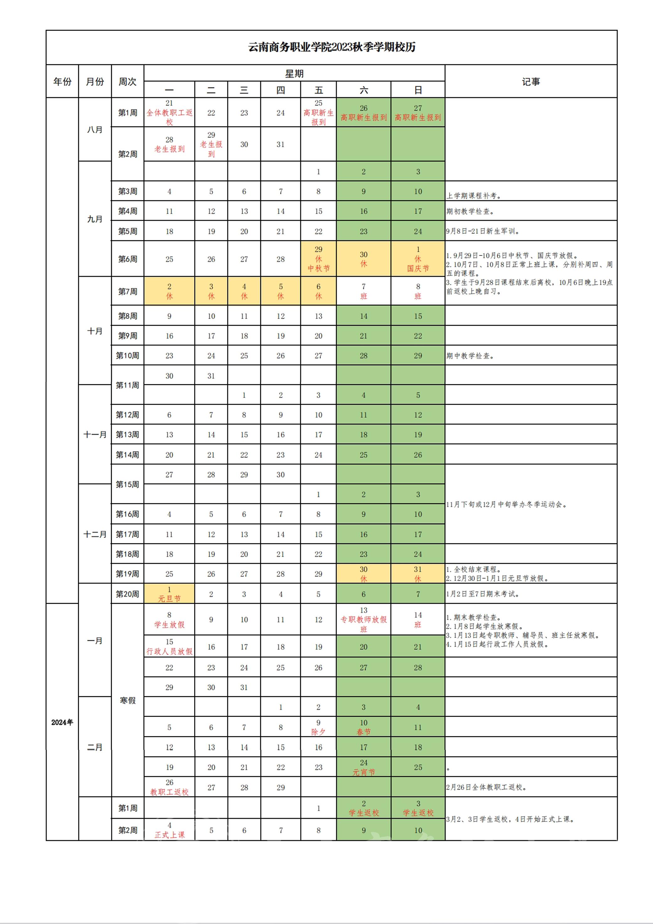 2024(学)年度春季学期校历(2024年2月26日~2024年8月26日)