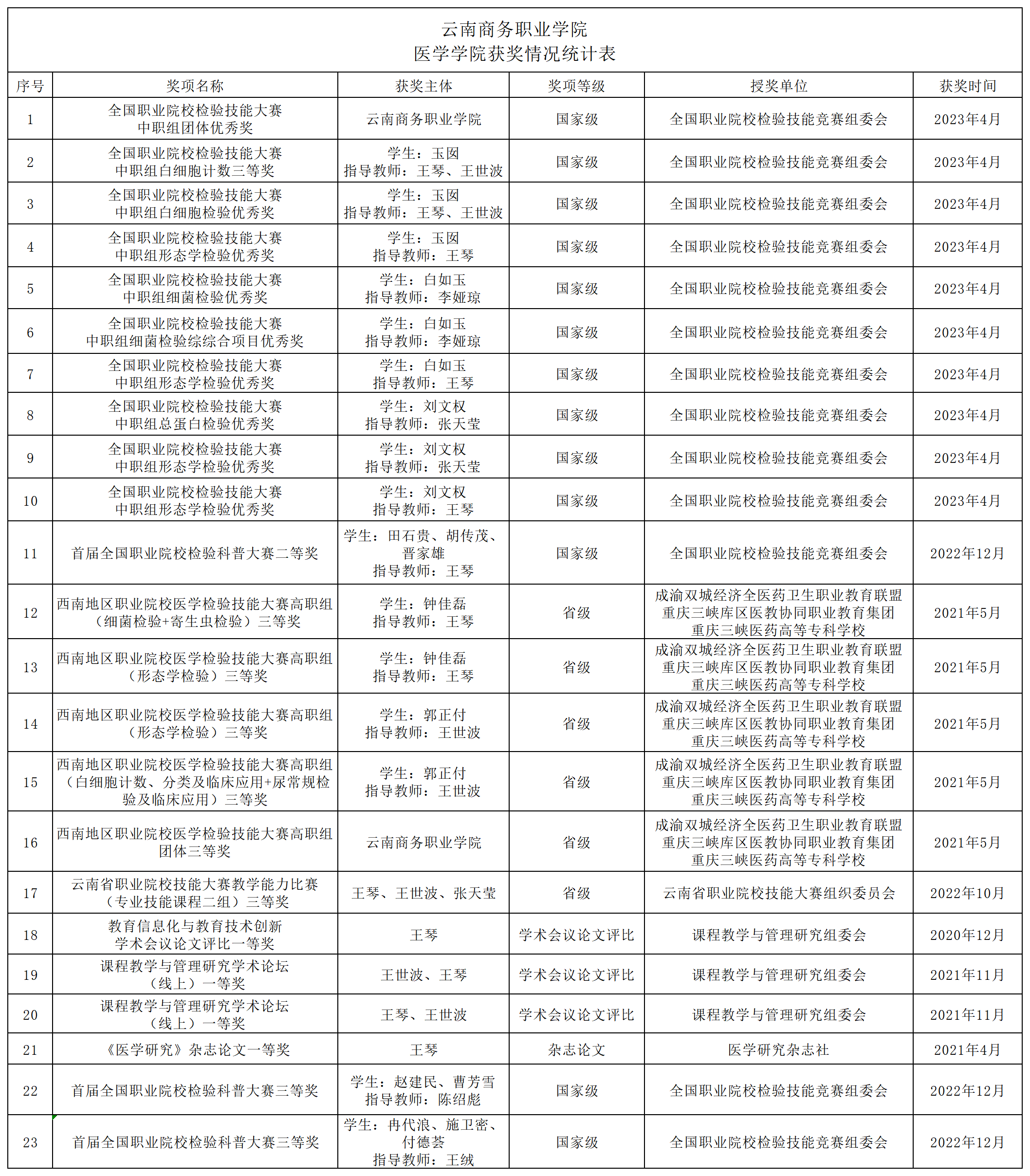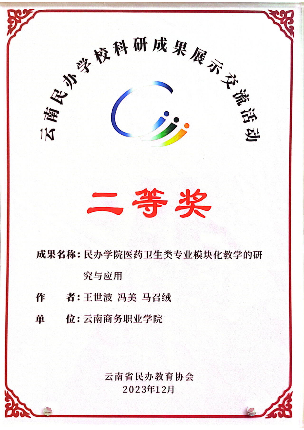 1.2023年获云南省民办学校科研成果“二等奖”1项。